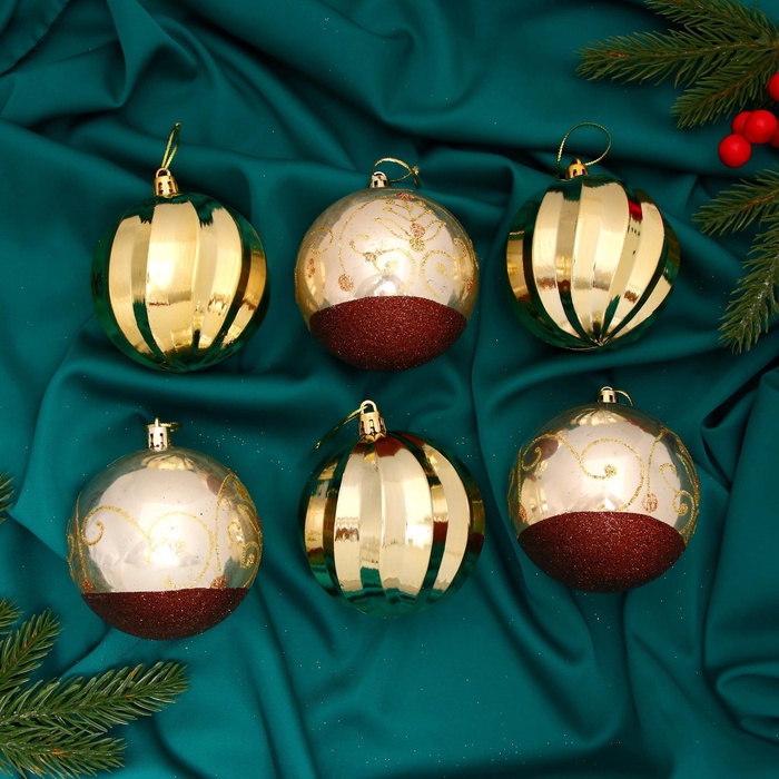 Набор из 6 ёлочных шаров диаметром 8 см сочетает классический дизайн с элементами ар-деко и новогоднего барокко в золотисто-коричневой гамме. Пластиковые украшения с однотонным покрытием и изящным рисунком создают благородное оформление праздничной ёлки.