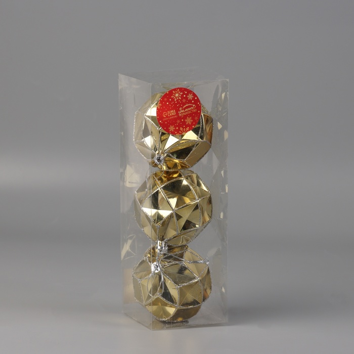 Набор из трёх золотистых ёлочных шаров диаметром 8 см сочетает в себе классический стиль с элементами ар-деко и новогоднего барокко. Однотонные украшения с геометрическим акцентом создают изящный и выразительный праздничный декор.