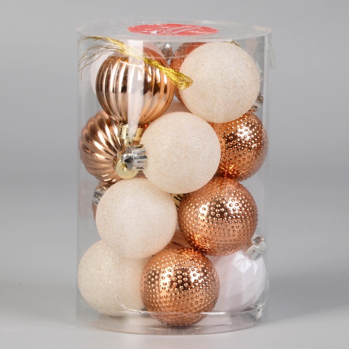 Набор из 16 новогодних шаров малого диаметра в бело-золотистой цветовой гамме привнесёт в праздничный интерьер изысканность и лёгкость. Украшения с узорчатой поверхностью гармонично сочетают классические и современные стили, создавая элегантный акцент на ёлке.