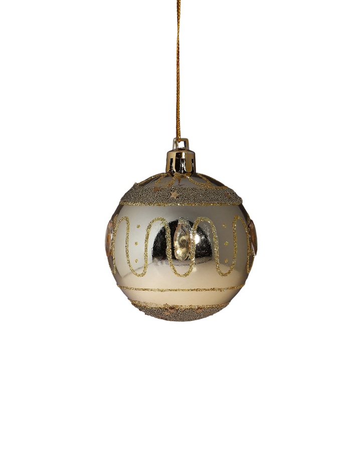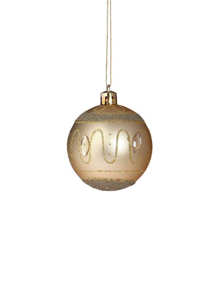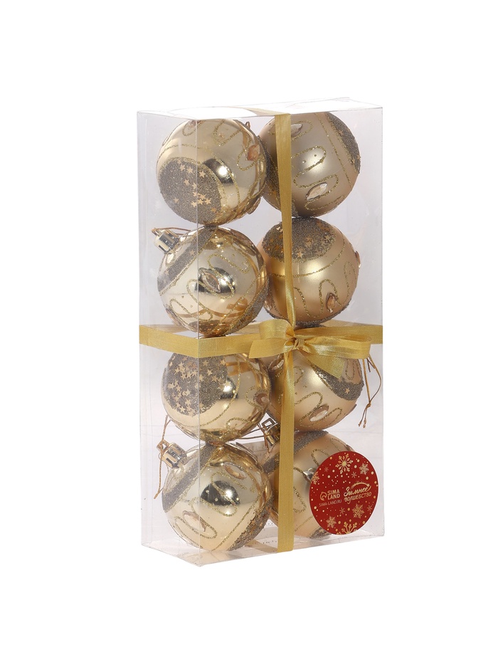 Набор из 8 золотистых ёлочных шаров диаметром 5,5 см с изящным рисунком, выполненным в классическом и ар-деко стилях с элементами новогоднего барокко. Эти пластиковые украшения создают праздничный акцент, объединяя традиции и изысканность в оформлении новогодней ёлки.