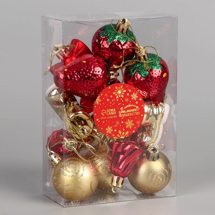 Новогодние игрушки «Клубничное настроение» — это яркий и разнообразный набор для украшения ёлки. В комплекте 15 пластиковых элементов в красно-золотистой гамме, выполненных в форме бантов, шаров, фруктов и сапожков. Декор подойдёт как для новогоднего барокко, так и для стилистики советской эпохи.