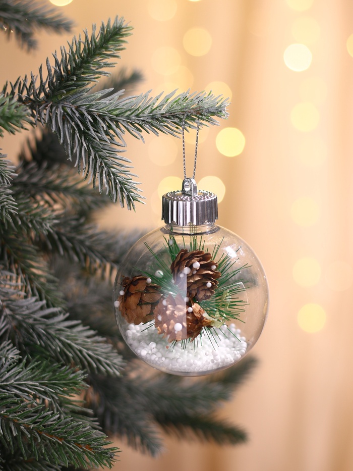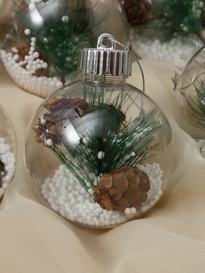 Эти игрушки словно взяты из зимнего леса — прозрачность пластика и объёмное наполнение создают эффект замерзших капель с природными акцентами. Они добавляют ёлке текстуру и глубину, не перегружая интерьер. Идеально подходят тем, кто любит праздновать в унисон с природой и без лишней вычурности.