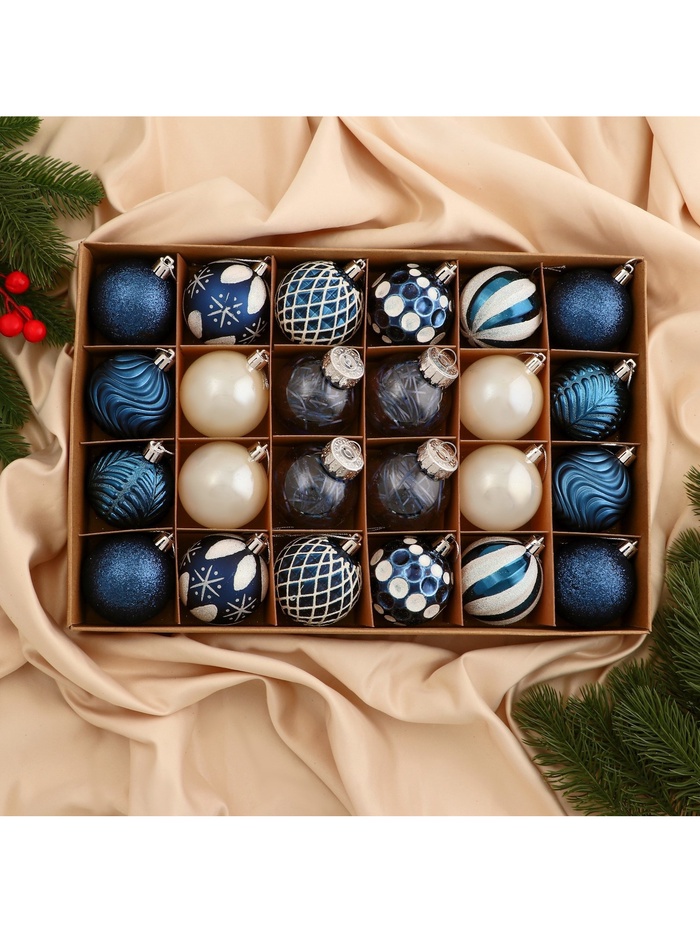 Набор из 24 ёлочных шаров диаметром 6 см выполнен в стиле фьюжн с бело-синей цветовой палитрой. Пластиковые игрушки сочетают однотонные, прозрачные и декорированные рисунками варианты с наполнением, создавая оригинальный и современный образ праздничного оформления.