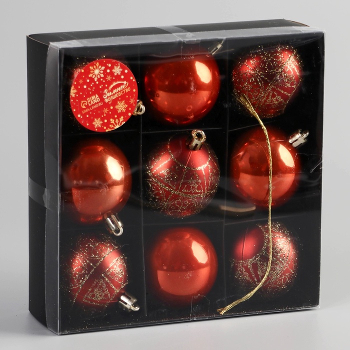 - Девять шаров с изящным рисунком, подчёркивающим тематическую новогоднюю атмосферу.