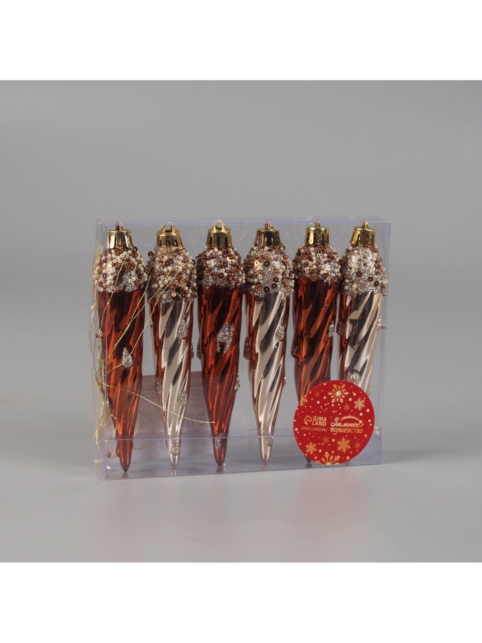 Создайте уютную роскошь на елке – золото-коричневые сосульки в стиле классики и шебби-шик! Золото-коричневые новогодние сосульки – набор из 6 игрушек, сочетающих строгость классики и винтажный шарм шебби-шик. Их высота – 13 см, что делает каждую заметным акцентом без перегрузки композиции.