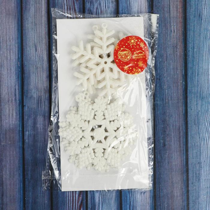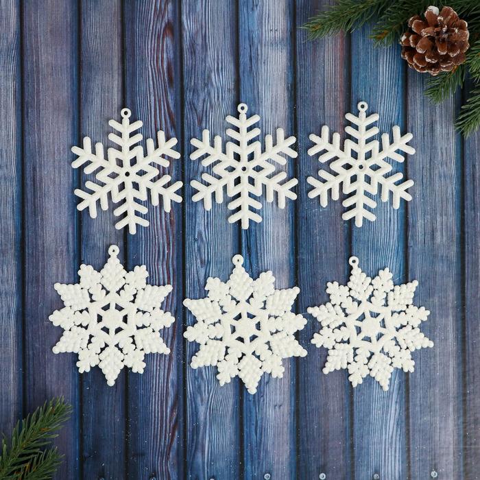 - Шесть снежинок с чёткой резьбой и разнообразными деталями.