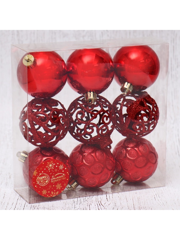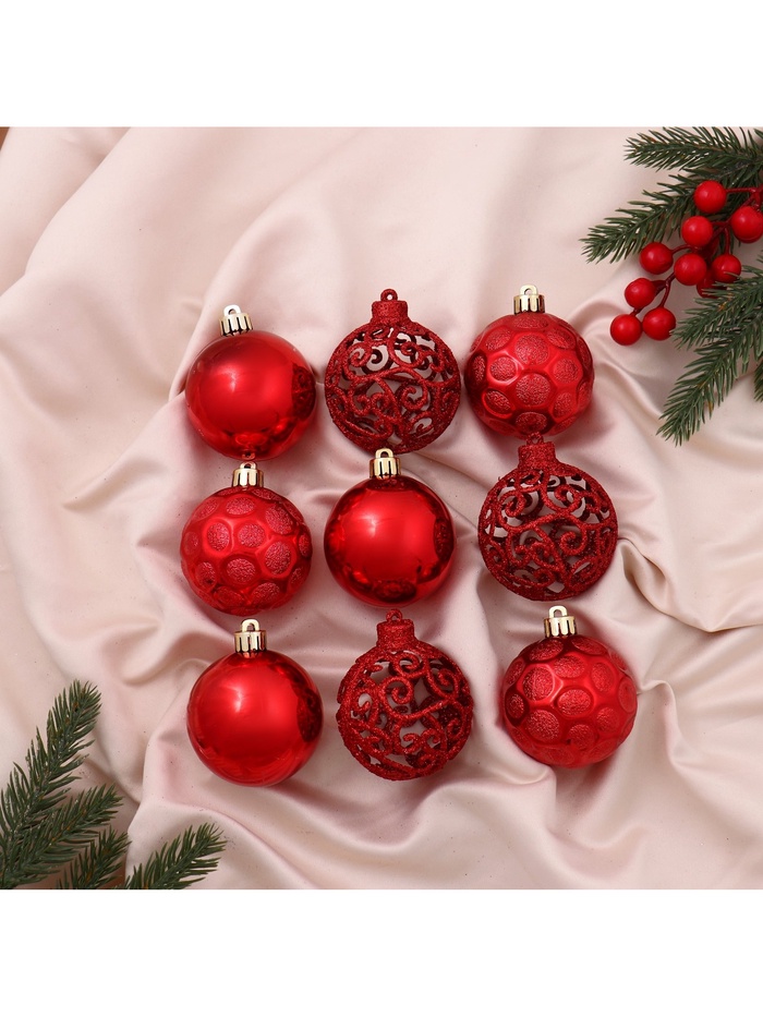 Добавьте изящества в новогодний декор! Набор из 9 красных шаров диаметром 6 см сочетает резные узоры с тремя стилями: барокко, скандинавским и фьюжн. Пластиковые шары лёгкие и удобные для украшения любой ёлки.