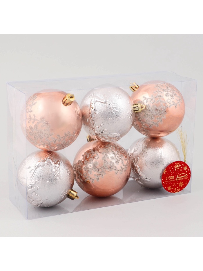 - 6 шаров диаметром 8 см с детализированным рисунком в золотистом оттенке.