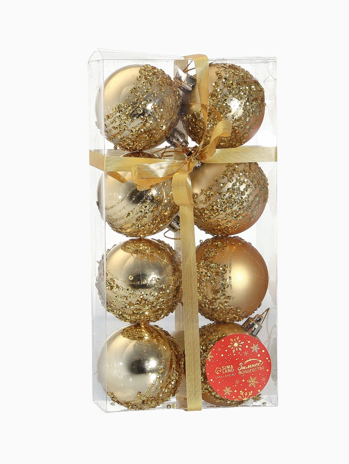 Пластиковые новогодние шары золотистого цвета с рисунком — это изысканное дополнение к праздничному декору для тех, кто ценит свет и детали в оформлении ёлки. Игрушки диаметром 6 см выполнены в классической форме и украшены узором, что добавляет им индивидуальности. Набор из 8 элементов подходит под стили барокко, ар-деко и строгой классики и станет ярким акцентом без пафоса.