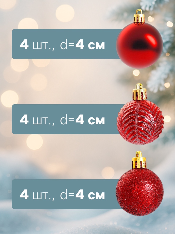 Новогодние шары красного цвета, 4 см в диаметре, набор из 12 штук — это базовый элемент праздничного декора. Насыщенный оттенок и компактные размеры позволяют создать плотное, но аккуратное украшение ёлки. Эти игрушки подходят под разные стили оформления: от «новогоднего барокко» до скандинавского минимализма.