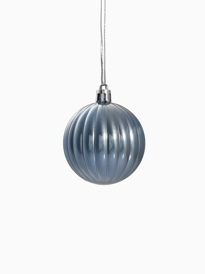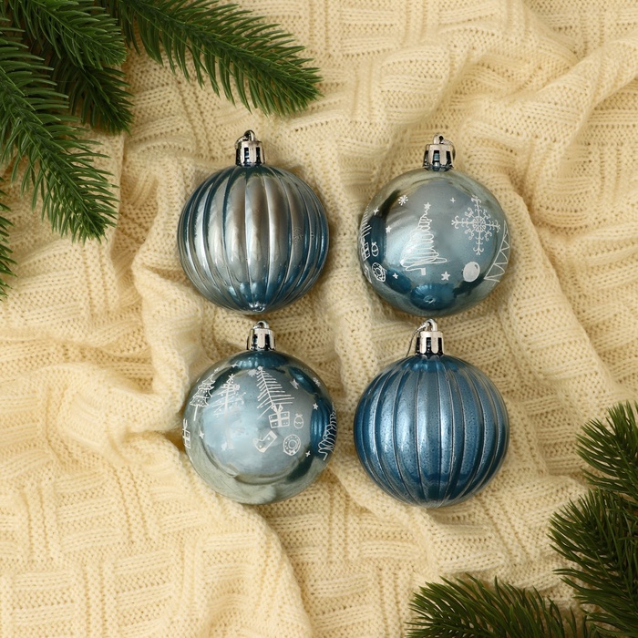 Набор из четырёх голубых шаров диаметром 5,5 см с полосатым рисунком выполнен в стиле шебби-шик. Эти пластиковые украшения добавляют нежности и винтажного шарма в новогодний декор, гармонично сочетаясь с другими праздничными элементами.