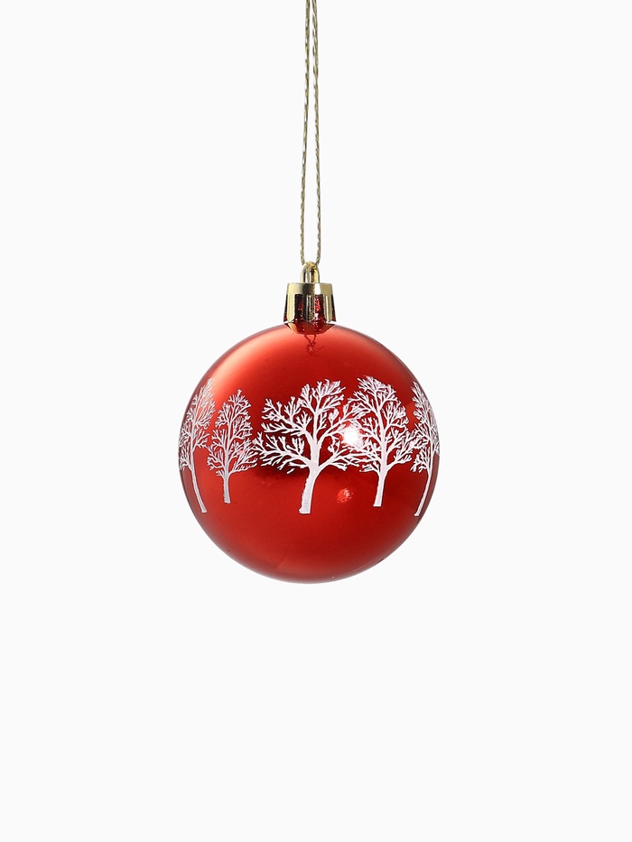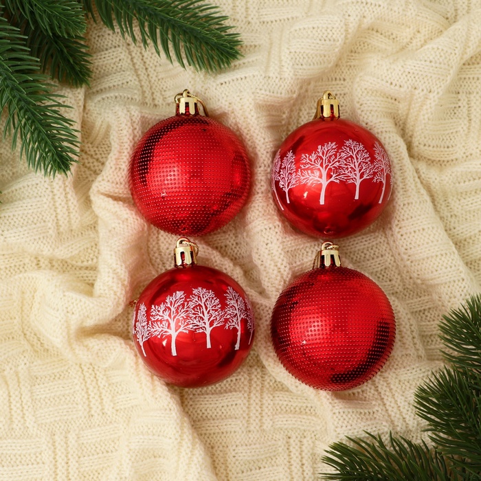 Набор из четырёх красных ёлочных шаров диаметром 5,5 см отражает атмосферу зимнего леса и объединяет стили новогоднего барокко, скандинавского минимализма, фьюжн и советского дизайна. Пластиковые шары с рисунком создают выразительный и многогранный декор для праздничной ёлки.