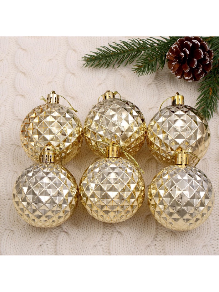 Пластиковые новогодние шары золотистого цвета с объёмной сеточкой — это стильное и необычное решение для праздничного декора. Игрушки диаметром 6 см выполнены в классической форме, но за счёт фактурной поверхности выглядят современно и оригинально. Набор из 6 элементов подходит под разные стили: от ар-деко до шебби-шик, и станет заметным акцентом на ёлке без излишней пышности.
