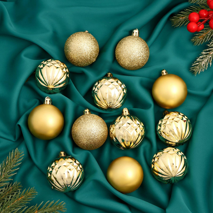 Новогодние шары «Олимпия грани» — это комплект из 12 золотистых украшений диаметром 5 см, выполненных в стиле классики, ар-деко и новогоднего барокко. Их лаконичный дизайн и насыщенный цвет создают ощущение праздника без лишней вычурности. Эти игрушки станут надёжной основой для ёлочного декора или ярким акцентом в уже собранной композиции.