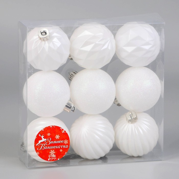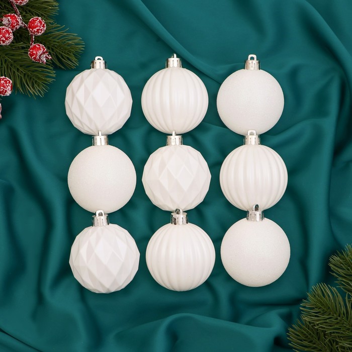 Пластиковые новогодние шары белого цвета с гранёной поверхностью — это стильное и лаконичное решение для праздничного украшения ёлки. Игрушки диаметром 6 см выполнены в классической форме, но благодаря текстуре выглядят современно и интересно. Набор из 9 элементов подходит под разные стили оформления: от строгой классики до датского минимализма.