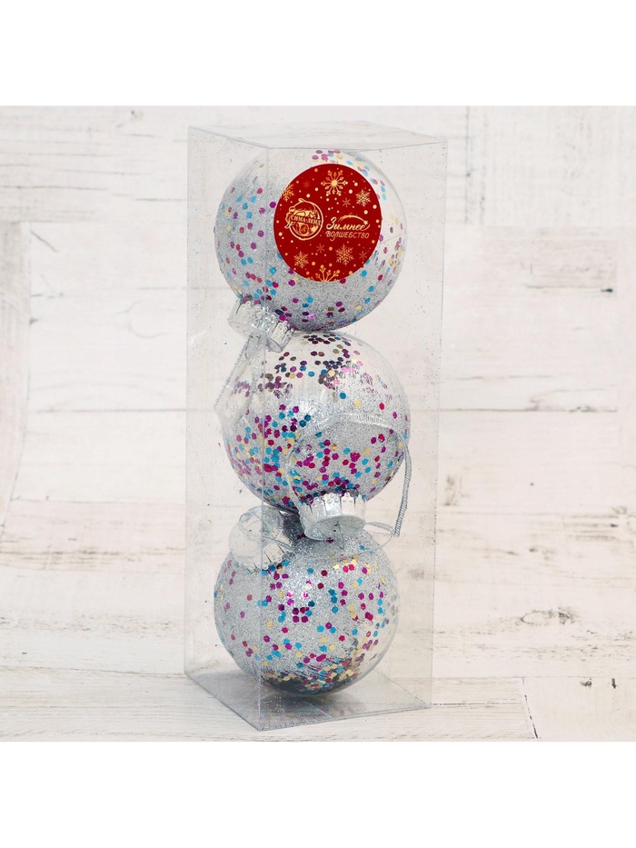Набор из 3 ёлочных шаров диаметром 8 см в стиле фьюжн сочетает серебристый, сиреневый и прозрачный цвета. Пластиковые украшения с рисунками и наполнением создают лёгкую и воздушную композицию для новогоднего декора.