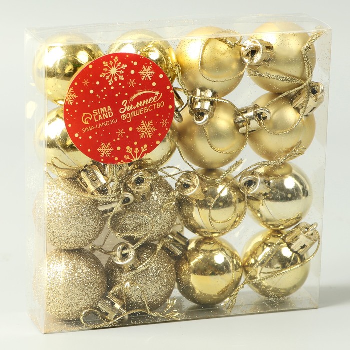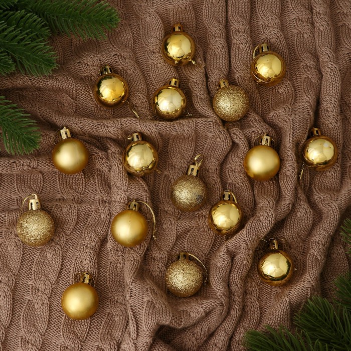 Новогодние шары «Праздничный переполох» — это набор из 16 миниатюрных украшений диаметром 3 см, выполненных в золотистом цвете. Изделия созданы в стиле классики, новогоднего барокко и ар-деко. Благодаря компактному размеру и насыщенному оттенку они станут ярким, но лаконичным элементом праздничного декора.