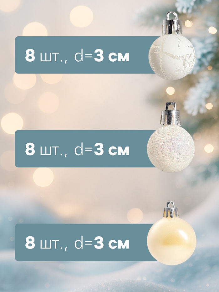 Пластиковые новогодние шары перламутрового и серебристого оттенков — это лёгкий способ создать праздничную атмосферу с ноткой изысканности. Игрушки диаметром 3 см выполнены в классической форме и подходят под разные стили оформления: от строгой классики до датского минимализма. Набор из 24 элементов идеален для плотного декора ёлки или создания светящихся акцентов на гирляндах.