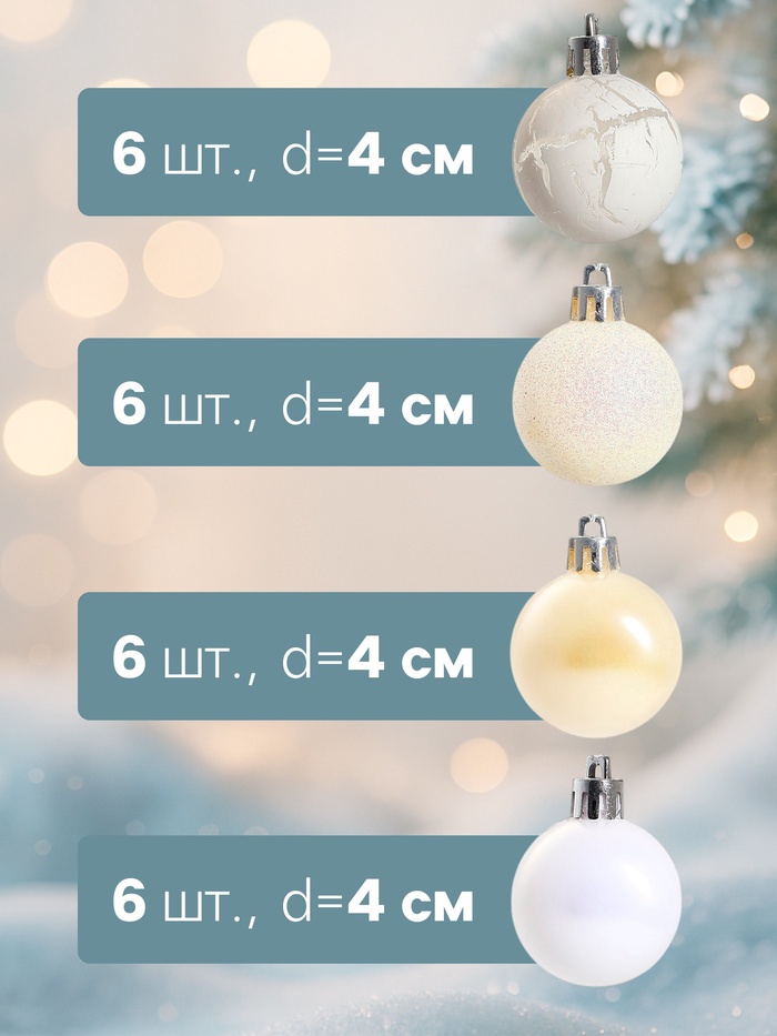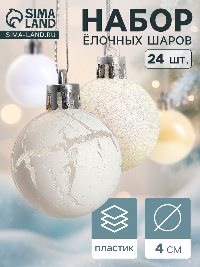 - В комплекте 24 шара, что позволяет создать полноценный и гармоничный декор для ёлки.