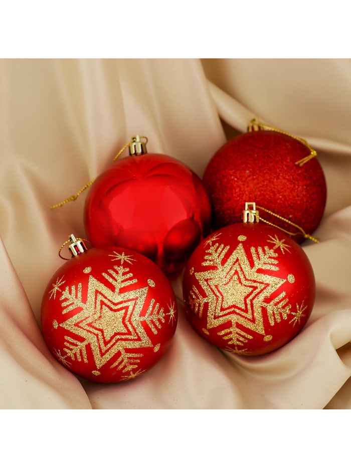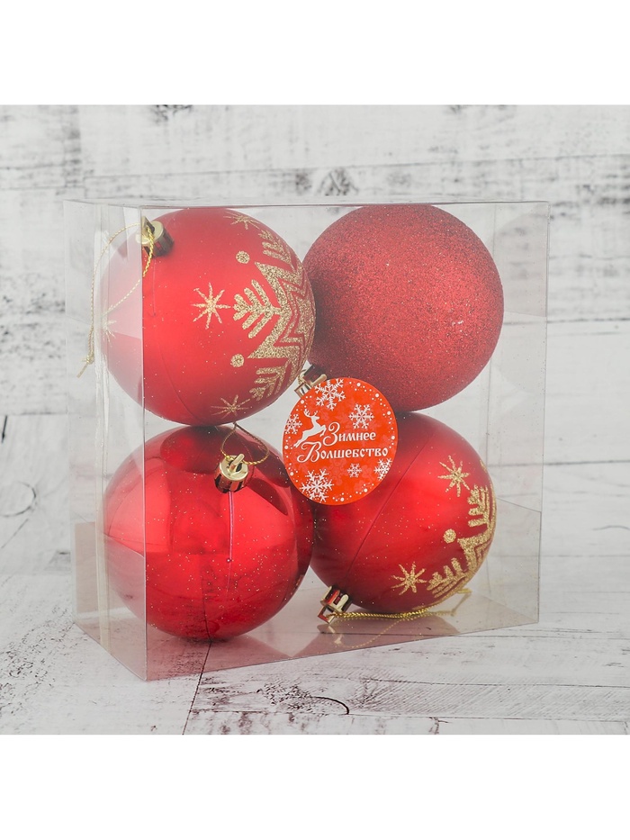 Новогодние шары красного цвета, 8 см в диаметре, набор из 4 штук — это яркий и запоминающийся акцент для праздничной ёлки. Игрушки с рисунком добавляют декору индивидуальности и делают образ ёлки более нарядным. Эти украшения подходят под разные стили: от «новогоднего барокко» до советской новогодней классики.