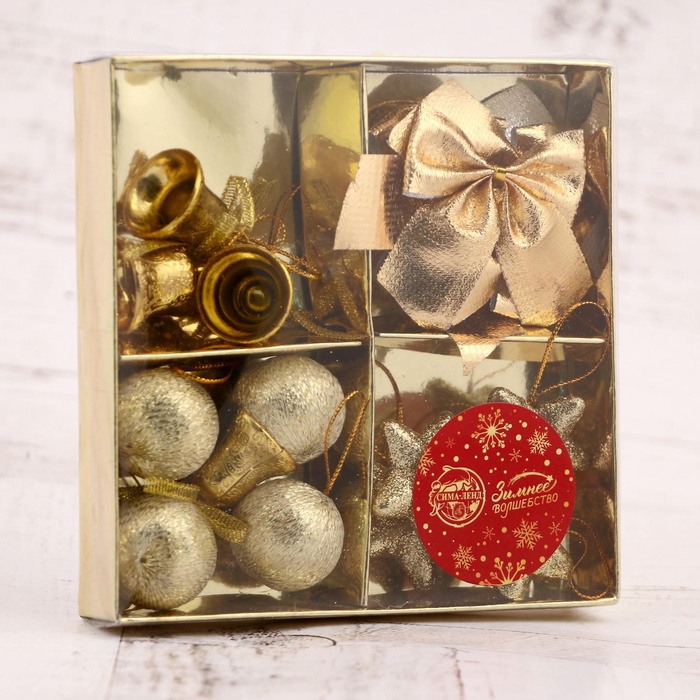 Этот набор создан для тех, кто хочет, чтобы праздник чувствовался во всех деталях. Золотые колокола, шары, звёзды и банты легко распределить по ветвям, создав эффект «лёгкого сияния». Подходят как для первого украшения, так и для обновления уже любимой традиции. Такие игрушки не просто украшают — они делают ёлку частью новогодней истории.