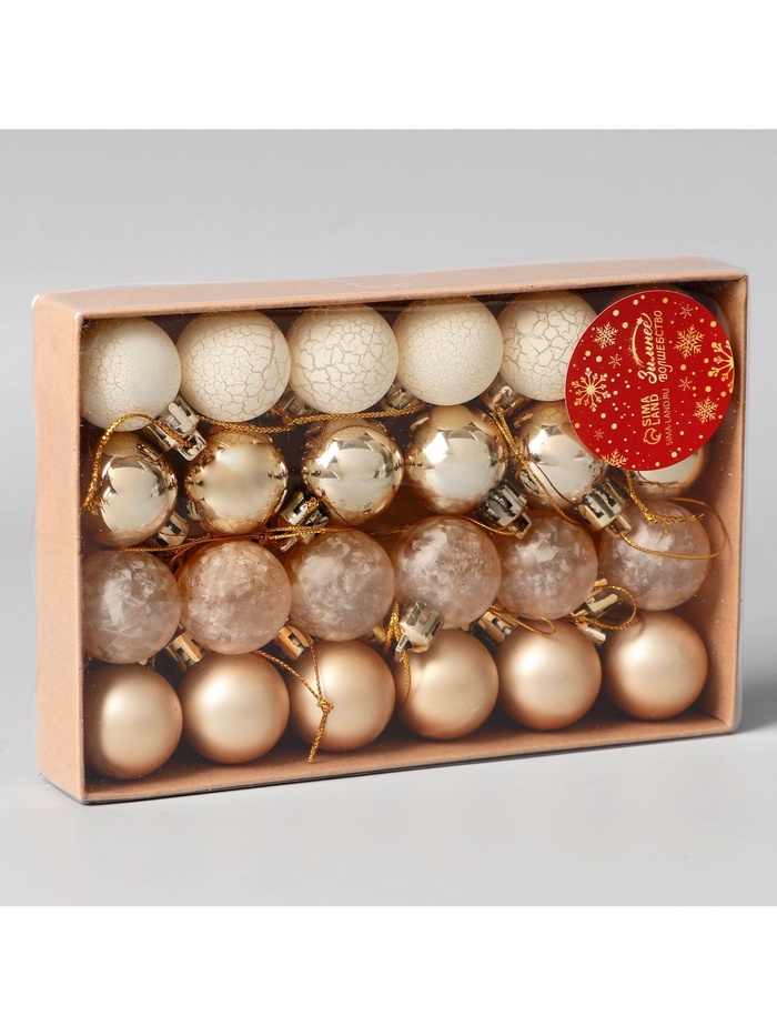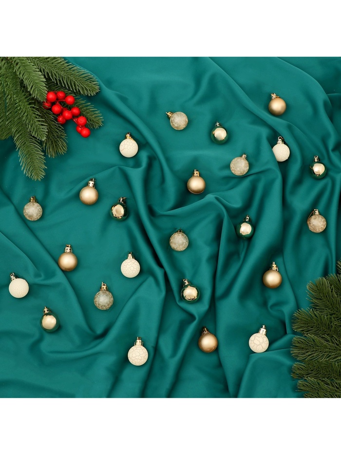 Новогодние шары «Традиция» — это набор из 24 миниатюрных украшений диаметром 3 см в золотисто-белой гамме. Изделия выполнены из прочного пластика и созданы в стиле классики, ар-деко и новогоднего барокко. Благодаря компактности и лаконичному дизайну они станут универсальным решением для праздничной ёлки.