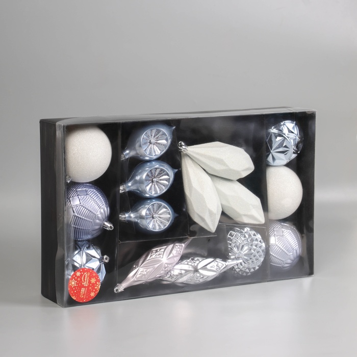 Набор из 16 новогодних украшений в сиренево-белой гамме объединяет 8 шаров и 8 сосулек с изящными рисунками в стиле шебби-шик. Пластиковые игрушки придают ёлке лёгкость и выразительность, создавая атмосферу нежности и праздничного уюта.