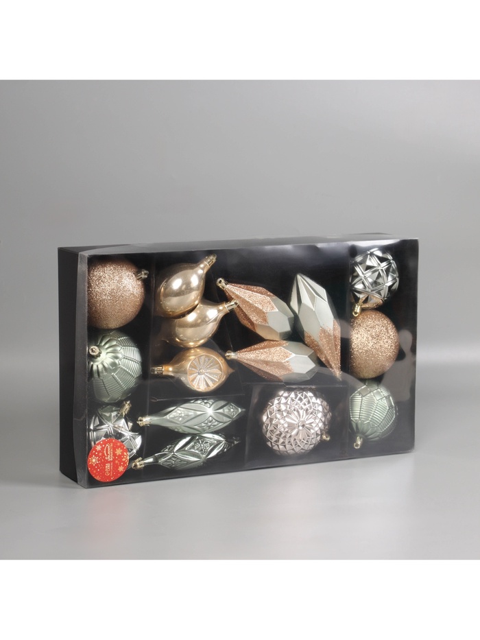 Набор из 16 ёлочных украшений в стиле шебби-шик и датского минимализма объединяет 8 шаров и 8 сосулек в спокойной зелено-коричневой гамме. Эти пластиковые игрушки создают уютную атмосферу новогоднего праздника, подчёркивая естественность и сдержанность декора.