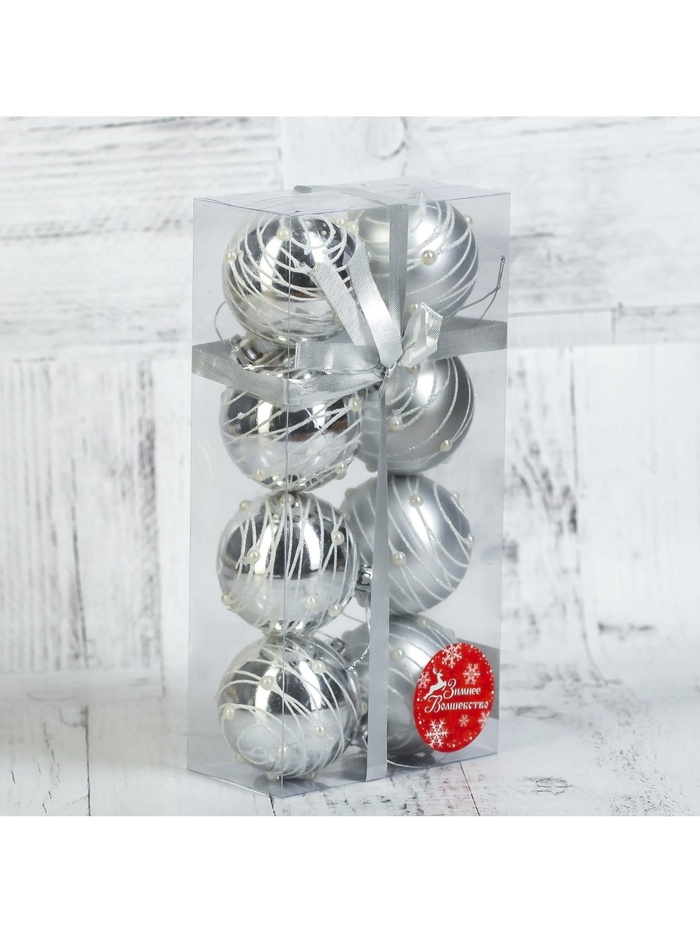 Свет зимнего праздника в каждом отражении. Новогодние шары «Жемчужный Орион» — это 8 украшений серебристого цвета, выполненных из прочного пластика. Диаметр каждого шара — 6 см, что делает их универсальными для любого размера ёлки. Дизайн сочетает датский минимализм, строгость ар-деко и скандинавский уют, создавая образ праздника, который остаётся в памяти надолго. Это не просто игрушки — они задают тон вашей зимней сказке.