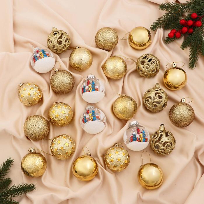 Ёлочные игрушки «Шары Зимний домик» золотистые с миксом — это тёплый и доброжелательный акцент для новогоднего убранства. Пластиковые шары в классической форме подходят для ёлки, подарков или окон — элемент праздничного декора в стиле ар-деко и зимней классики для тех, кто ценит свет, форму и атмосферу чуда без вычесленности.