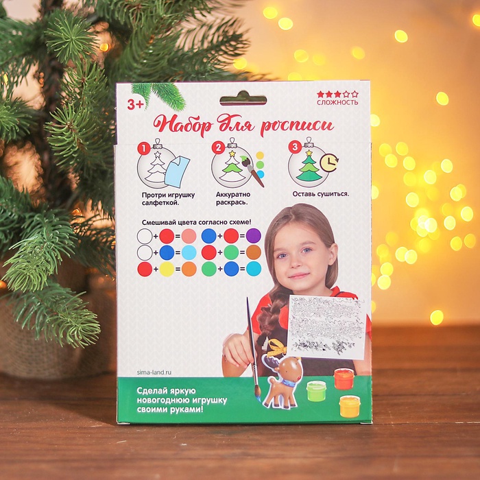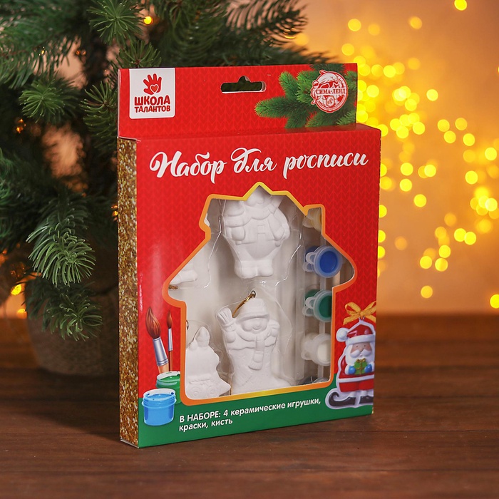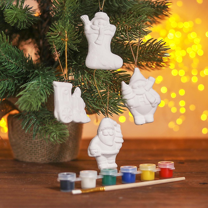 4 гипсовые подвески-основы, 6 акриловых красок и кисть.