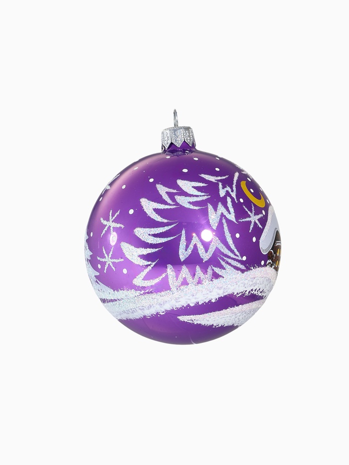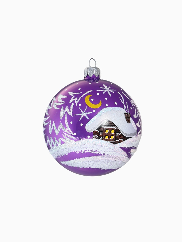 Этот шар похож на тихий уголок леса, где избушка хранит воспоминания о простых радостях. Его рисунок пробуждает мысли о зимних вечерах и близости природы, наполняя интерьер смыслом и спокойствием в праздничные дни.
