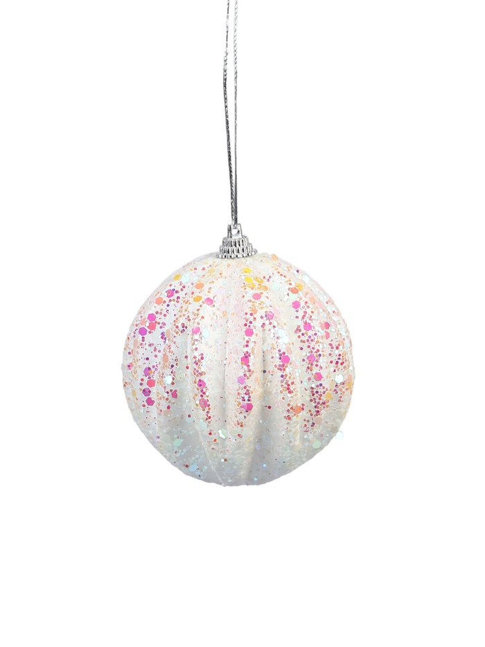 Белый ёлочный шар диаметром 8 см с сияющими полосами станет ярким акцентом в новогоднем оформлении. Его элегантная форма и нежный цвет создают атмосферу зимней сказки и уюта. Лёгкий пластиковый материал облегчает развешивание и хранение, что делает его идеальным выбором для праздника.