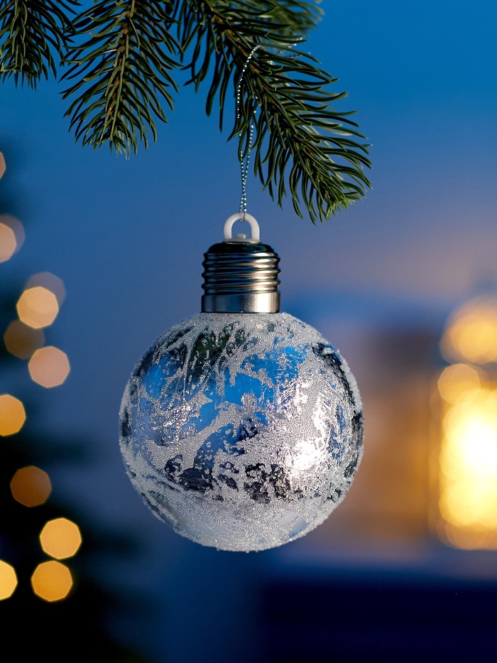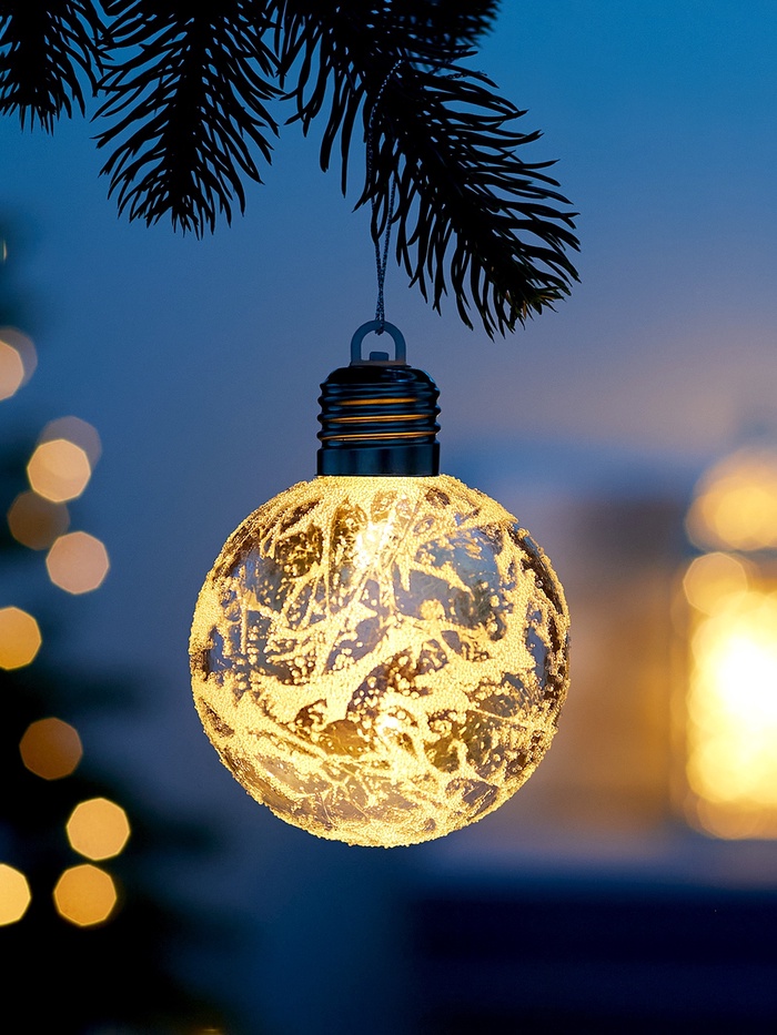 Встроенный светодиод, питающийся от трёх батареек LR44, создаёт постоянное тёплое белое свечение, подчёркивая изысканный оттенок шара и придавая ёлке волшебное сияние. Благодаря автономному питанию, этот шар легко разместить в любом месте без ограничений по длине проводов.