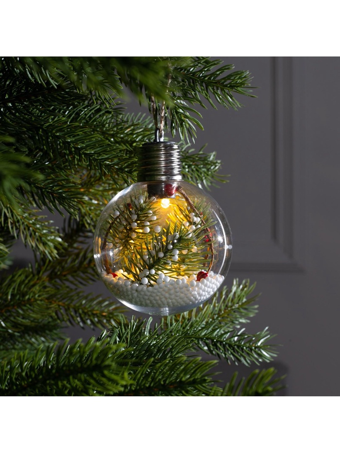 Новогодними игрушками традиционно украшают пушистые елочки, окна и ветки деревьев на улице, ведь переливы белых огоньков вселяют в сердца нотки очарования и радости. Ёлочные шары оригинально выглядят в зимнем декоре. Теплые огни притягивают взгляд, наполняют сердца ощущением волшебной сказки и создают вокруг уютно-праздничную атмосферу.