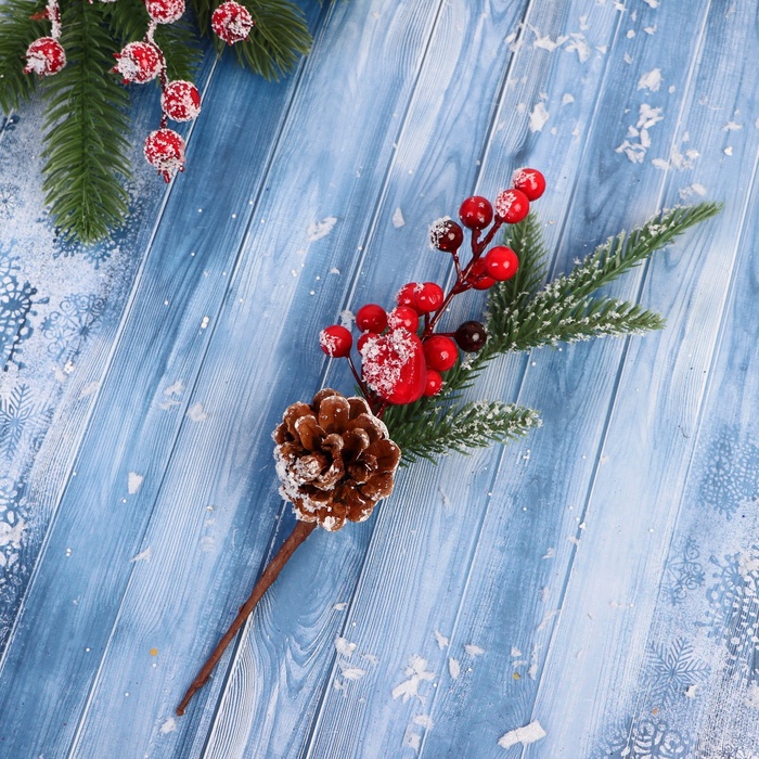 Эта ветка делает дерево частью вашей личной зимней истории. Красные тона и фактурные элементы работают вместе, чтобы передать атмосферу чуда, семейного уюта и ожидания подарков. Используйте её как основной акцент или фоновое дополнение — одинаково хорошо усиливает дух торжества и доброжелательность дома.
