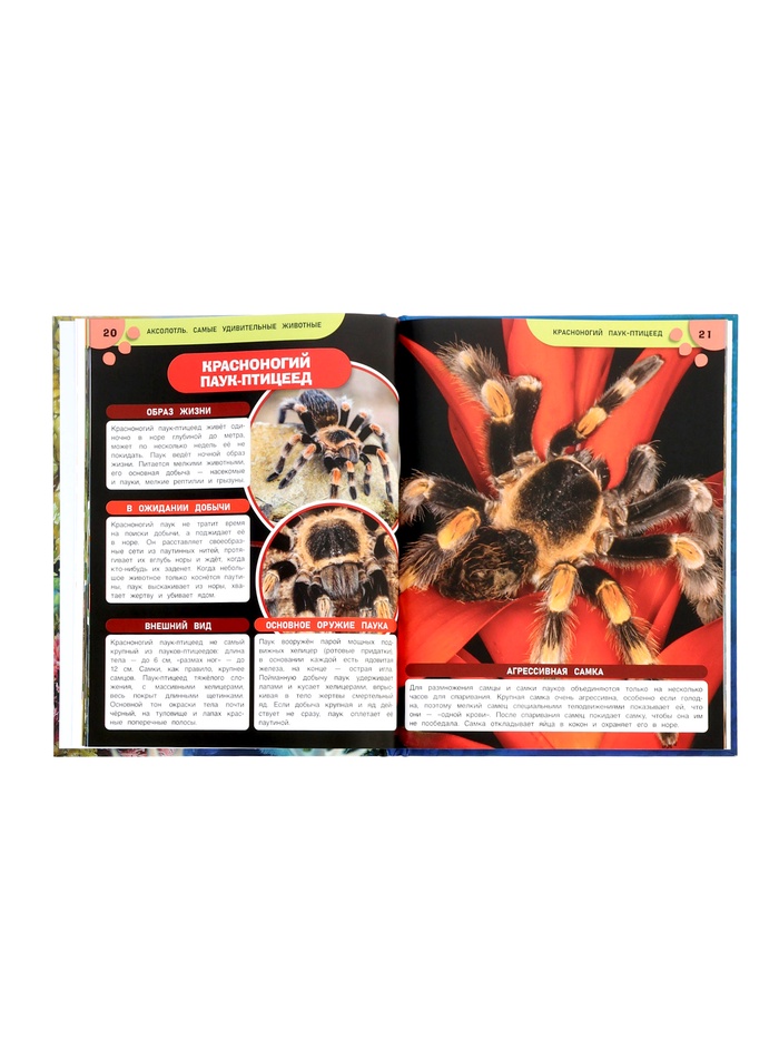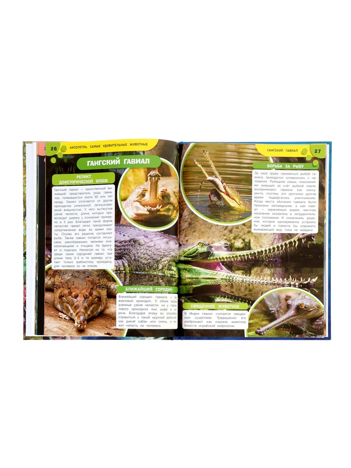 - 48 страниц с увлекательными фактами о самых удивительных животных: аксолотле, утконосе, хамелеоне Джексона, морском коньке и других.