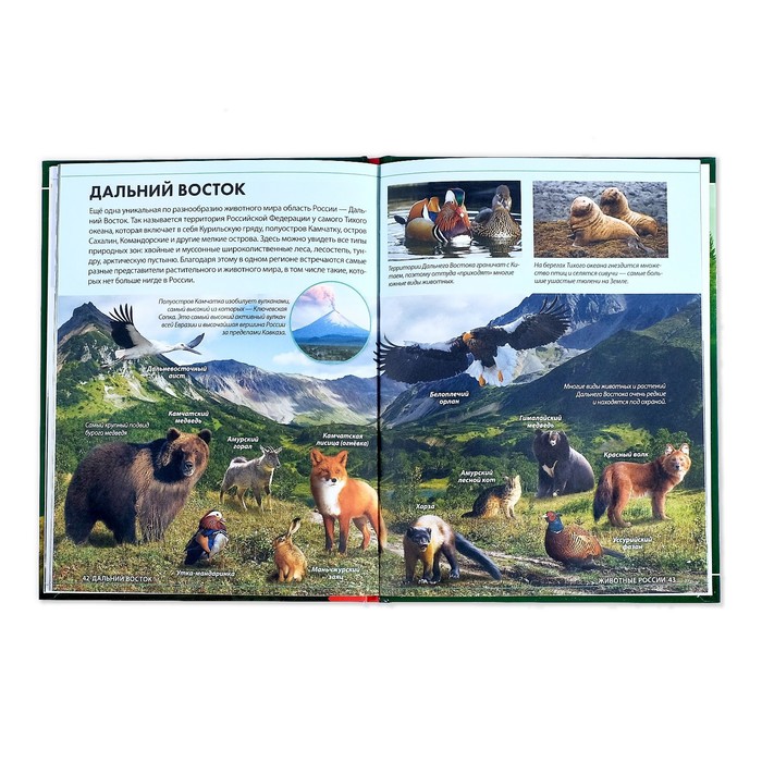 Детская энциклопедия «Животные России». Густая тайга и льды Арктики, ледяные пустыни, высокие горы и бескрайние степи — повсюду в нашей стране обитают разнообразные и такие удивительные животные! Факты из книги помогут ребёнку узнать больше о жизни удивительных братьях наших меньших.