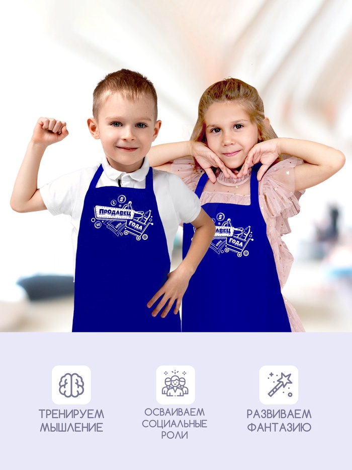Игра в продавца учит ребёнка считать, общаться и фантазировать. Фартук используют на творческих занятиях с сухими материалами — он защитит одежду во время лепки или рисования. Набор подходит мальчикам и девочкам от 3 лет.