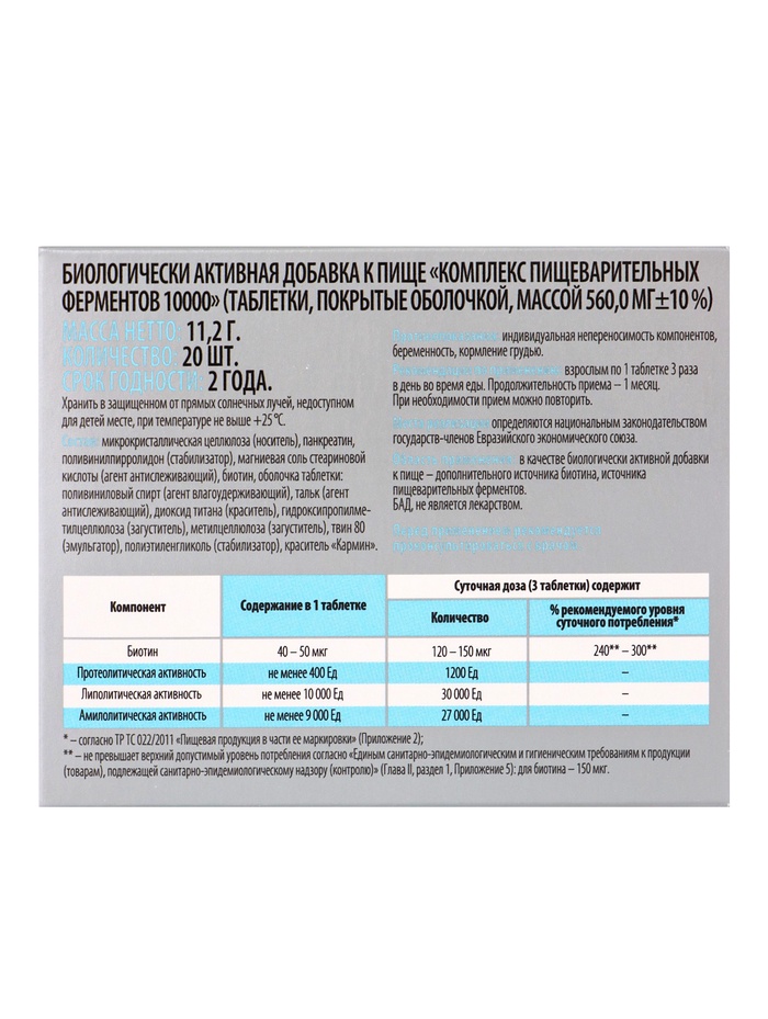 - Высокая активность ферментов. 10 000 единиц активности в одной таблетке для максимальной поддержки пищеварения.