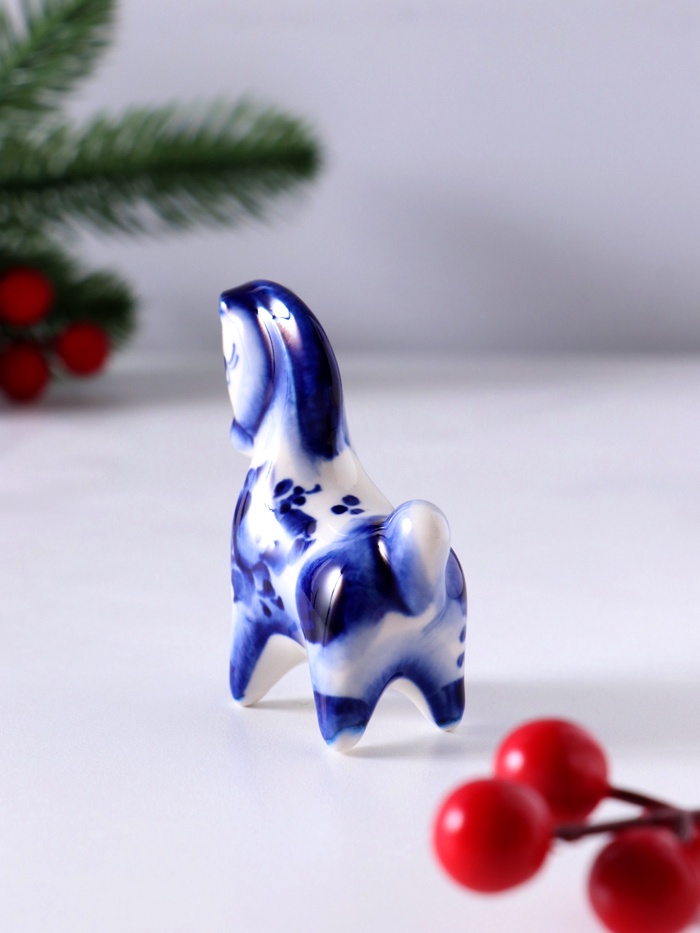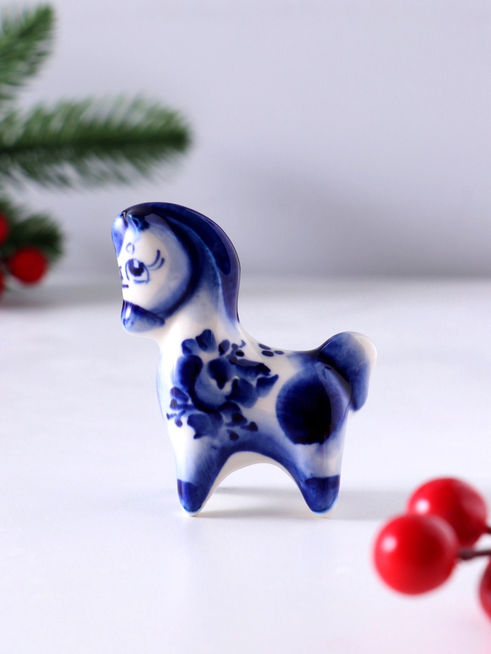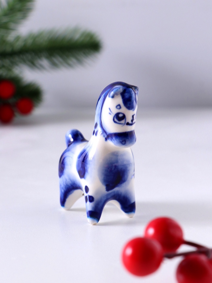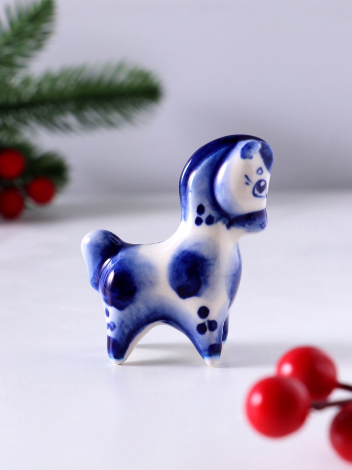Представляем вашему вниманию очаровательную фарфоровую фигурку «Конь Мираж», которая станет изюминкой вашего интерьера. Эта миниатюра, выполненная в традиционном гжельском стиле, обладает размерами 6.5×5.5×2.5 см и излучает атмосферу уюта и тепла, благодаря своей бело-синей палитре.