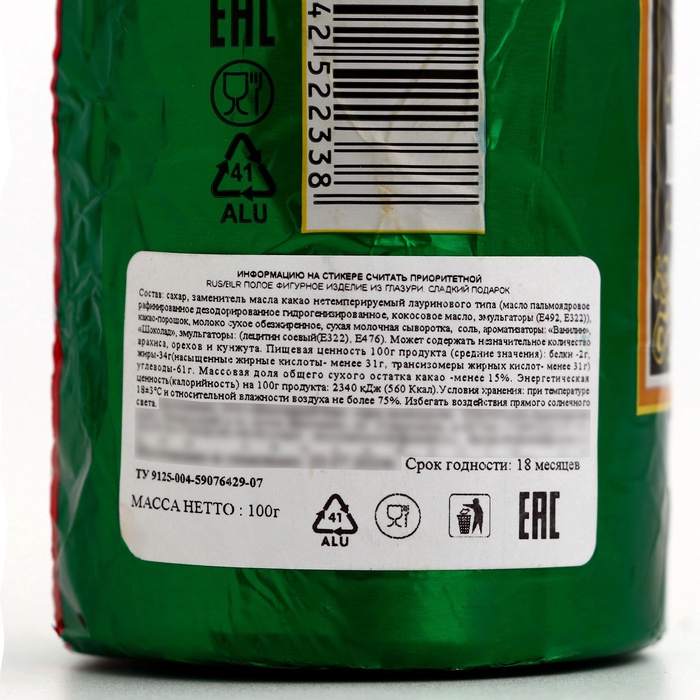 Состав: сахар, заменитель масла какао нетемперируемый лауринового типа (масло пальмоядровое рафинированное дезодорированное гидрогенизированное, кокосовое масло, эмульгаторы (Е492, Е322)), какао-порошок, молоко сухое обезжиренное, сухая молочная сыворотка, соль; ароматизаторы: «Ванилин», «Шоколад»; эмульгаторы: (лецитин соевый (Е322), Е476). Может содержать незначительное количество арахиса, орехов и кунжута.