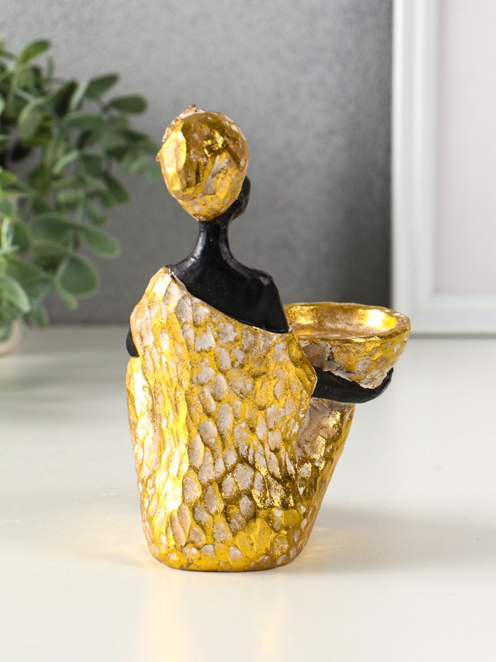 Эта изысканная подсвечник-статуэтка в виде африканской женщины привнесёт в ваш интерьер ноты утончённой эстетики и тёплого, живого света. Она становится центром притяжения взглядов, создавая неповторимую атмосферу уюта и гармонии.