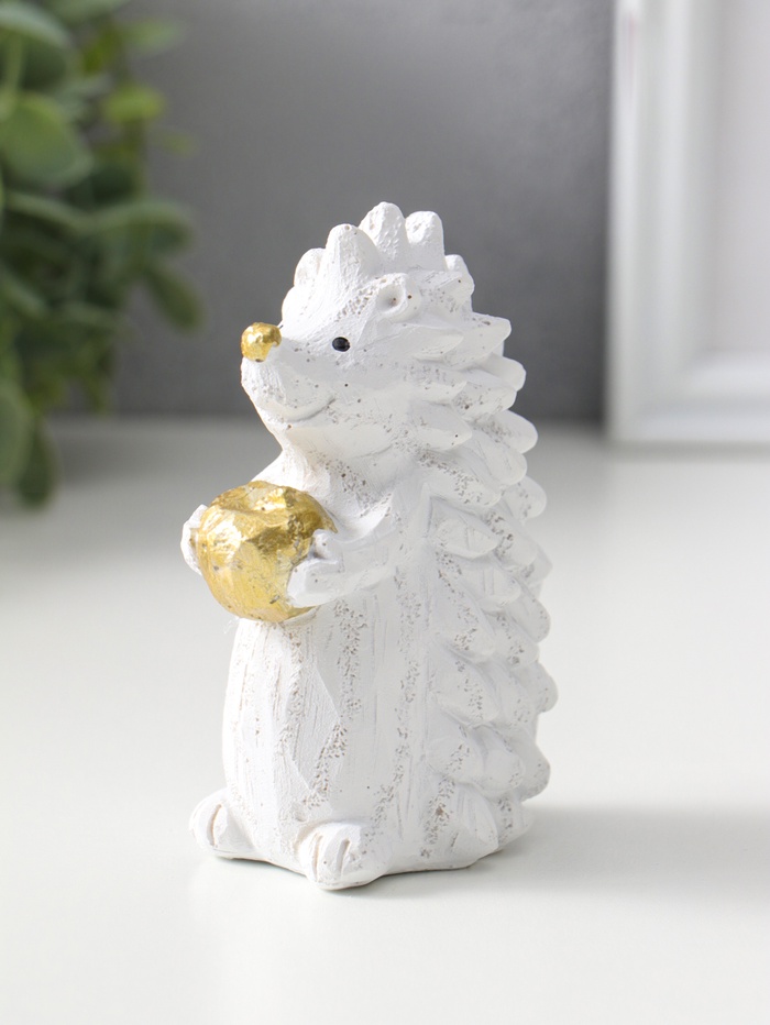 Эта фигурка ёжика — маленький хранитель уюта и символ простых радостей. Он несёт в лапках золотое яблочко, будто только что вернулся из осеннего леса. Белоснежная поверхность с деликатным золотым покрытием создаёт ощущение лёгкости и праздника, делая образ одновременно трогательным и нарядным.