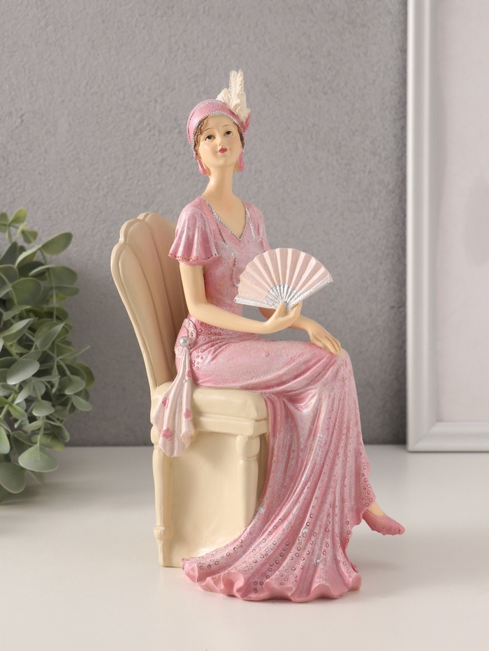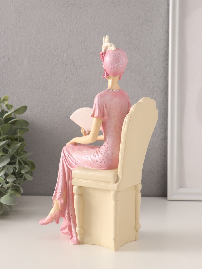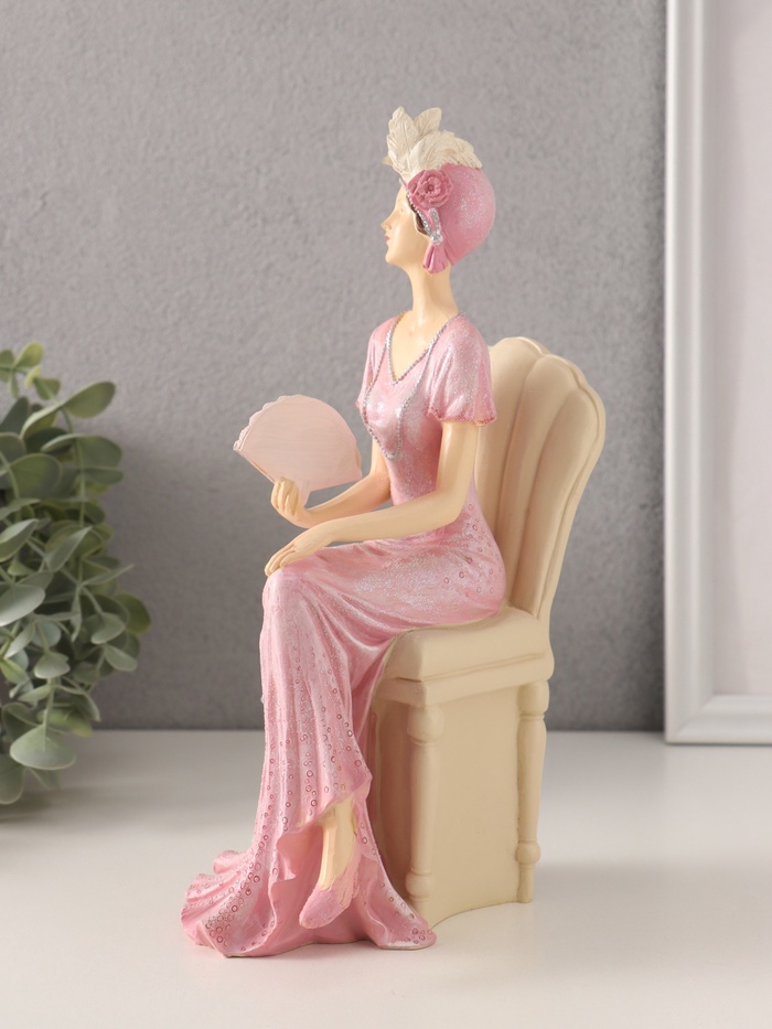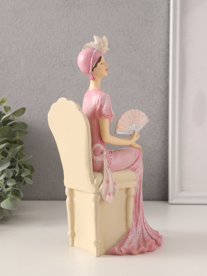 Представляем вашему вниманию изысканную статуэтку дамы в розовом платье с веером, устроившейся в кресле. Высотой 25 см, эта фигурка привлекает внимание своей элегантностью и детализированной проработкой. Розовые и разноцветные акценты добавляют изделию нежности и делают его универсальным решением для любого интерьера.