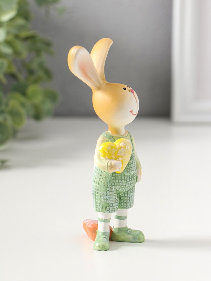 Этот зайчик в зелёном комбинезоне — трогательное признание в любви, застывшее в уютной фигурке. Он создан, чтобы дарить тепло и напоминать о самом важном. В его руках — символ нежности, жёлтое сердце, а в позе — безмятежность домашнего уюта. Такой подарок говорит без слов: «ты дорог мне».