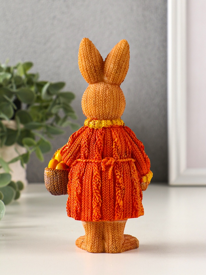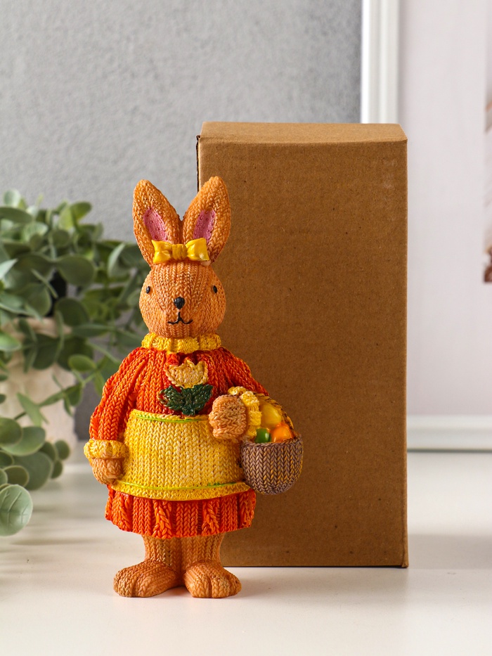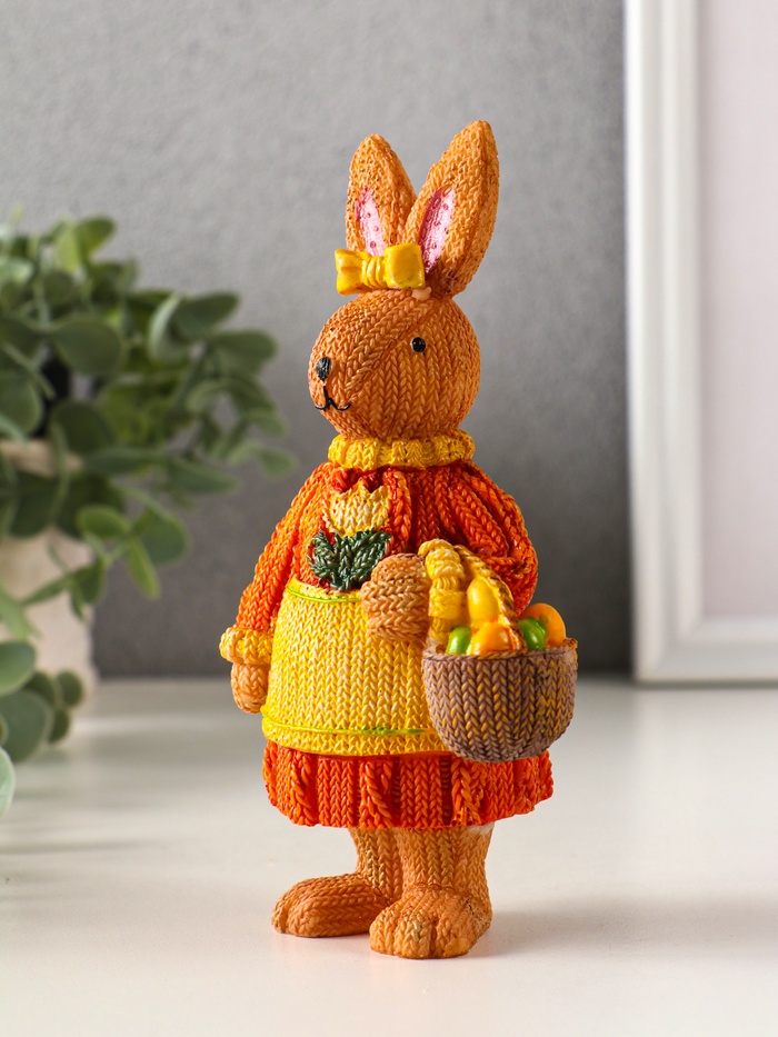 Эта очаровательная фигурка зайки в вязаном платье создаёт тёплую, домашнюю атмосферу праздника. Она станет сердцем вашего пасхального декора и милым акцентом в интерьере на протяжении всего года. Держа в лапках плетёную корзинку с пасхальными яйцами, зайка словно только что принесла этот подарок прямо к вашему праздничному столу.
