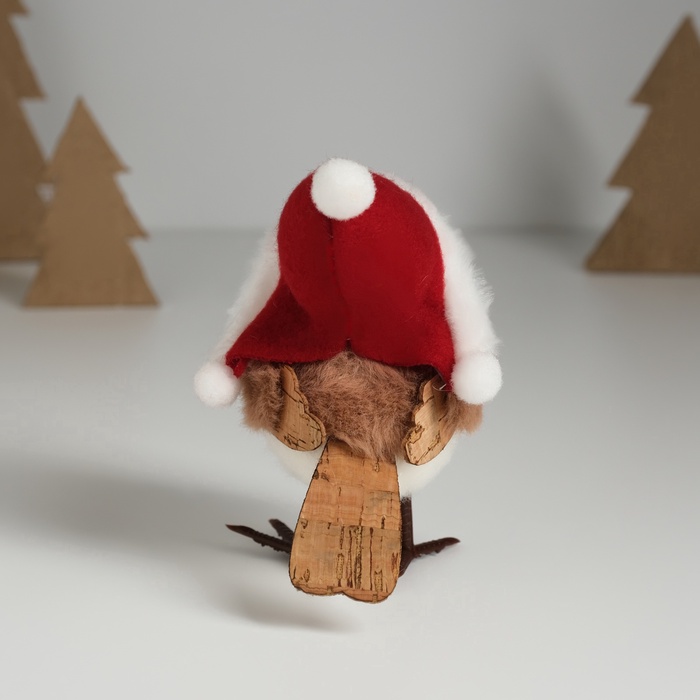 - Текстильный воробушек в новогоднем головном уборе: Фигурка изображает милого птенца в шапочке. Его используют для создания праздничных композиций на полке, камине или праздничном столе. Образ получается трогательным и душевным.