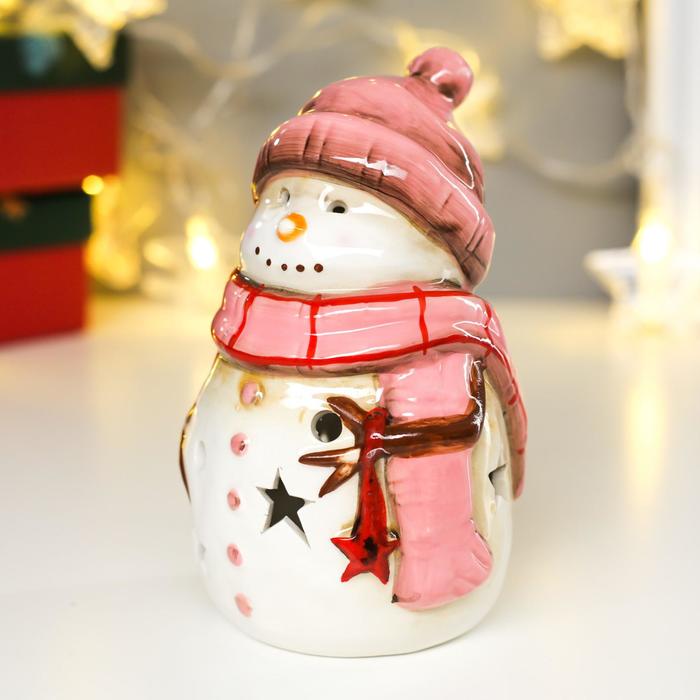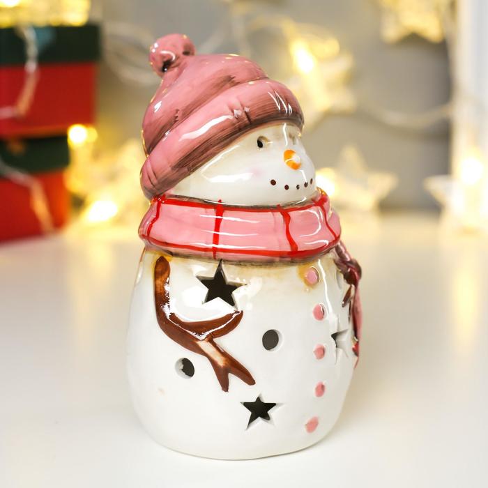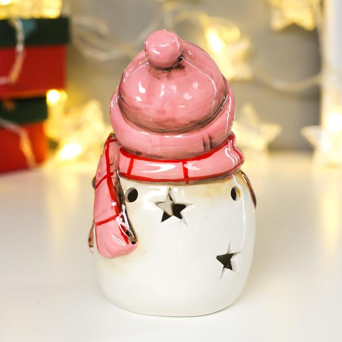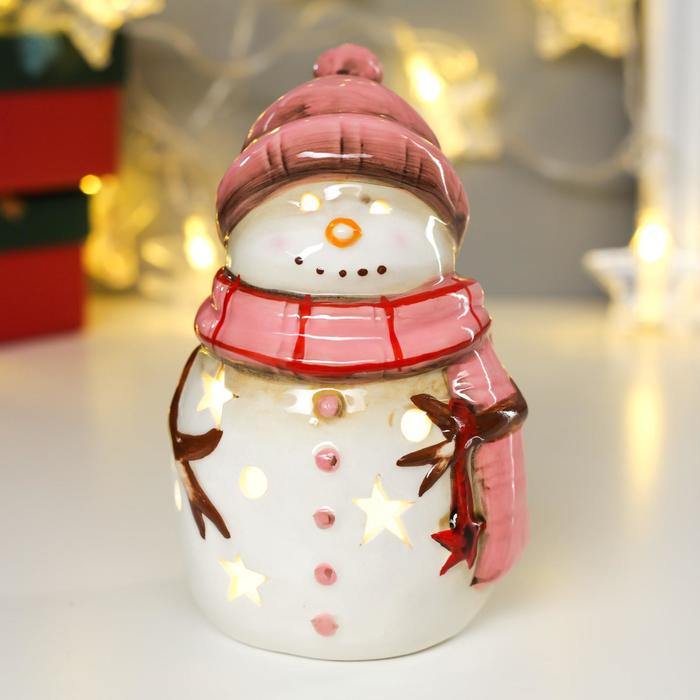 Фигурка светящаяся керамика «Снеговик в розовой вязаной шапке и шарфе», 13.5×8×8.3 см