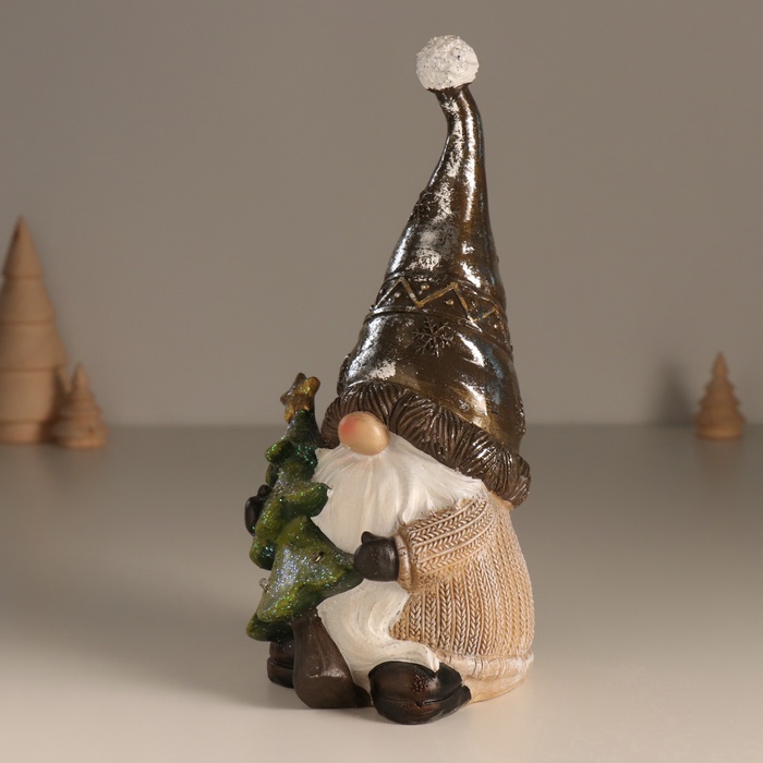 Фигурка светящаяся полистоун «Дед Мороз в колпаке, с ёлкой», беж и шоколад, 10.5×10.5×22 см